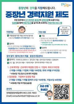 노사발전재단 전북중장년내일센터(센터장 이명숙)는 50대 이상 중장년 구직자와 전북지역 기업을 대상으로 2026년 '중장년경력지원제' 사업을 시행한다고 4일 밝혔다. '중장년경력지원제'는 주된 업무에서 퇴직 후 경력 전환을 위해 자격을 취득했거나 훈련을 이수한 50대 이상 중장년에게 ▲현장실무경험 ▲직무 멘토링·마인드 교육 ▲디지털 역량 교육 등을