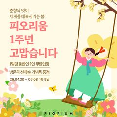 전북 남원시의 미디어아트 전시관이자 복합문화공간인 '피오리움(Fiorium)'이 개관 1주년을 맞아 오는 30일부터 5월8일까지 '더블 감사 혜택'이란 프로모션을 진행한다고 16일 밝혔다. 남원의 대표축제인 '제96회 춘향제'와 연계해 축제의 즐거움을 배가시키자는 취지의 프로모션이다. 춘향제 방문객이 매표소에 사진이나 영수증 등 인증 내역을 제시