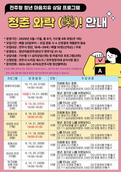 전북 전주시는 학업과 취업 스트레스 등으로 심리적 어려움을 겪는 청년들의 마음 건강 회복을 돕기 위해 청년 마음치유 상담 프로그램 '청춘와락(樂)'을 운영한다고 10일 밝혔다. 이 프로그램은 1대 1 상담과 감각 중심 체험형 치유 활동을 결합한 단계적 회복 모델로 청년들의 정서적 소진을 완화하고 일상 회복을 지원하기 위해 마련됐다. 운영 대상은