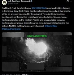 미군 남부사령부는 8일(현지시간) 동태평양 마약 밀매 항로에서 마약 밀매 의심 선박을 타격했다고 밝혔다. 남부사령부는 소셜미디어 엑스(X·옛 트위터) 계정에서 "합동임무부대 '서던 스피어(Southern Spear)가 지정 테러 단체가 운영하는 선박에 대해 치명적인 물리적 타격을 수행했다"고 밝혔다. 이어 "정보당국
