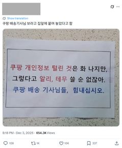 쿠팡의 대규모 개인정보 유출 사태에도 불구하고, 적절한 대체 플랫폼이 부재한 상황에서 소비자들이 여전히 쿠팡 서비스를 계속 이용할 것이란 전망이 나온다. 지난 3일 X(구 트위터)에는 "쿠팡 배송기사님 보라고 집앞에 붙여 놓았다고 함"이라는 글과 함께 사진 한 장이 올라왔다. 사진에는 "쿠팡 개인정보
